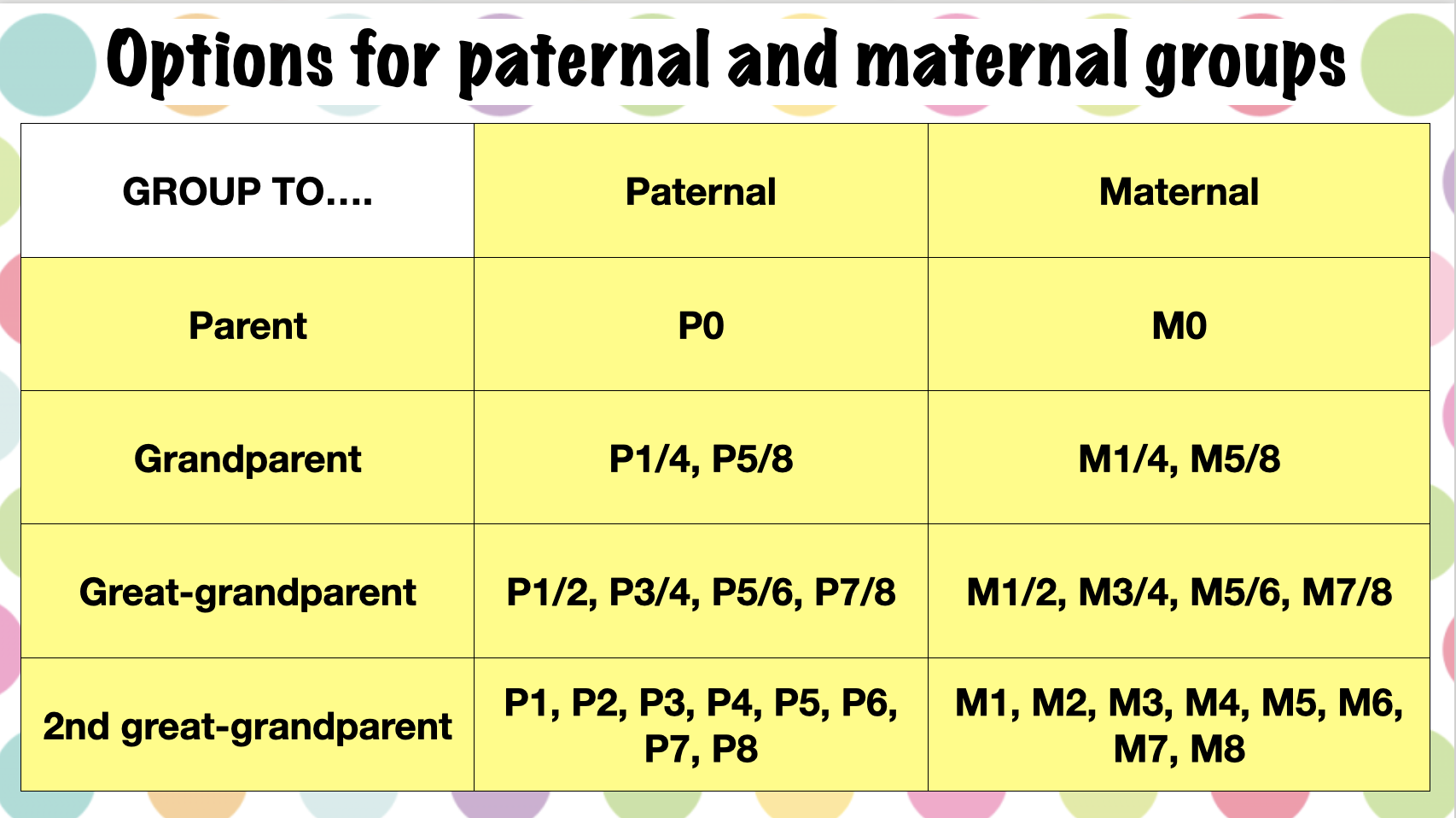- Set up one group for the potential paternal matches (inferred as not maternal) and four groups for each of the maternal great-grandparents - P0, M1/2, M3/4, M5/6 and M7/8.